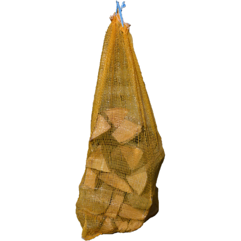 Leña cortada en trozos de 33 cm envasada en mallas de 50 dm3.
